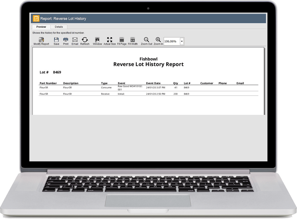 Fishbowl can then provide complete forward and reverse Tracking reports to see where a raw ingredient batch was used and then who the finished product was sold to or a QA issue on a finished product where you can see what raw material batches were used. Making food audits much easier.