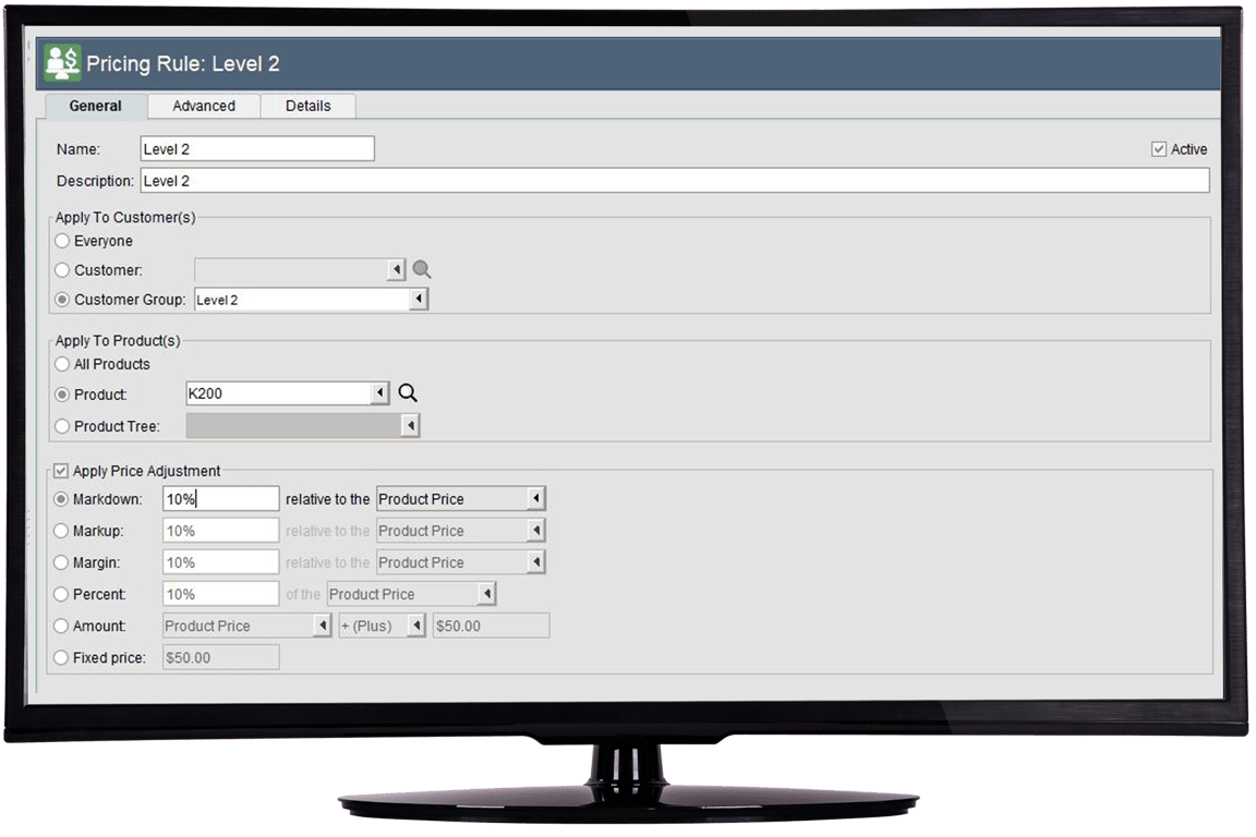 Whether by customer group or specific customer, product group or individual product. Calculate as a mark down, margin or mark-up, quantities breaks or date driven. It’s all there!